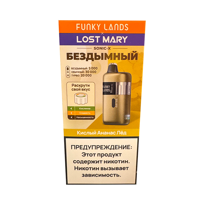 Fanky Lands & Lost Mary Sonic X Кислый Ананас Лед вобрала в себя баланс сладкого и кислого оттенков тропического ананаса, дополненного лёгким ледяным акцентом. English variant of flavor — Sour Pineapple Ice — раскрывает ту же композицию в международной интерпретации. При затяжке ощущается прохлада и сладость, плавно переходящая в мягкое послевкусие. Устройство рассчитано примерно на 30000 затяжек, оснащено ёмким аккумулятором на 600 мА·ч и функцией Type-C зарядки. Оно подходит тем, кто ценит надёжную конструкцию, чистый вкус и простоту использования. Купить данную электронку можно по отличной цене, а её компактный формат идеально подойдёт как для новичков, так и для опытных вейперов.